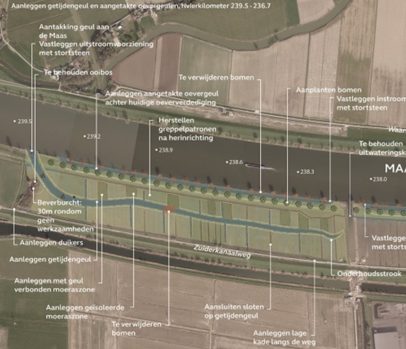 Aanleggen oevergeul over een totale lengte van 2,5 kilometer parallel aan de Bergsche Maas, plus aanleggen 1,4 kilometer lange getijdengeul in het westelijke deel van de uiterwaard. Status: Projectbesluit Omgevingswet onherroepelijk vastgesteld. Momenteel wordt de uitvoering voorbereid.