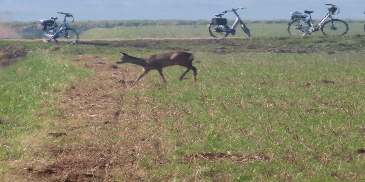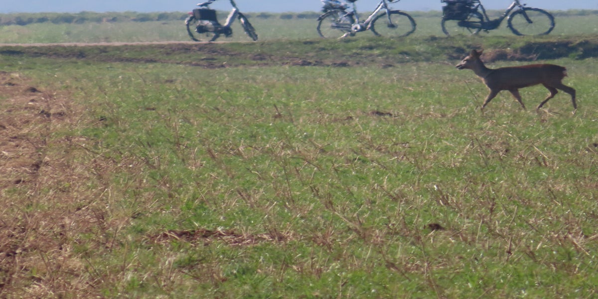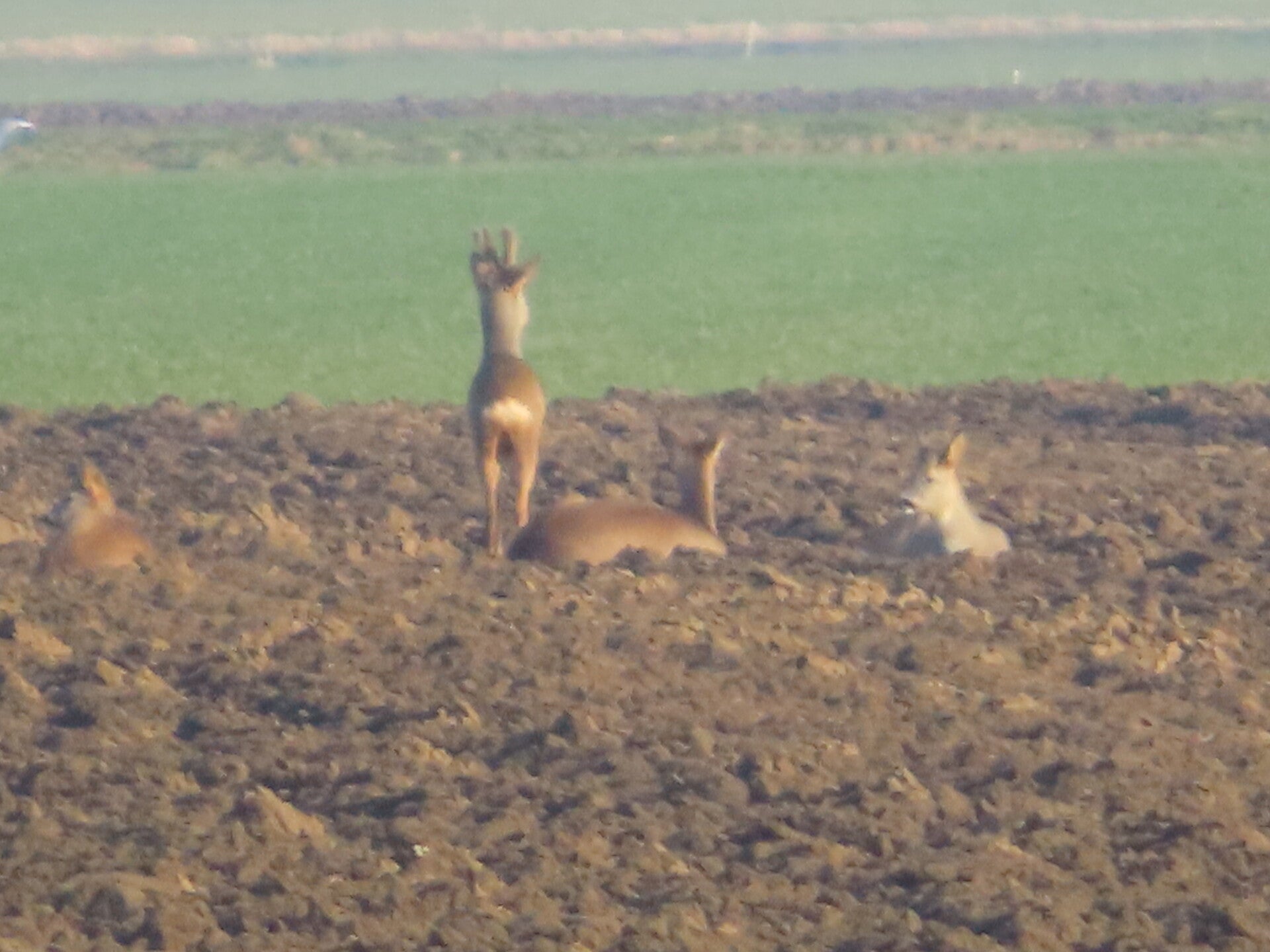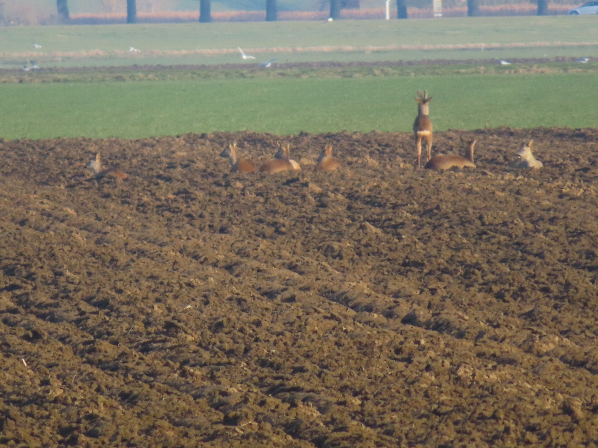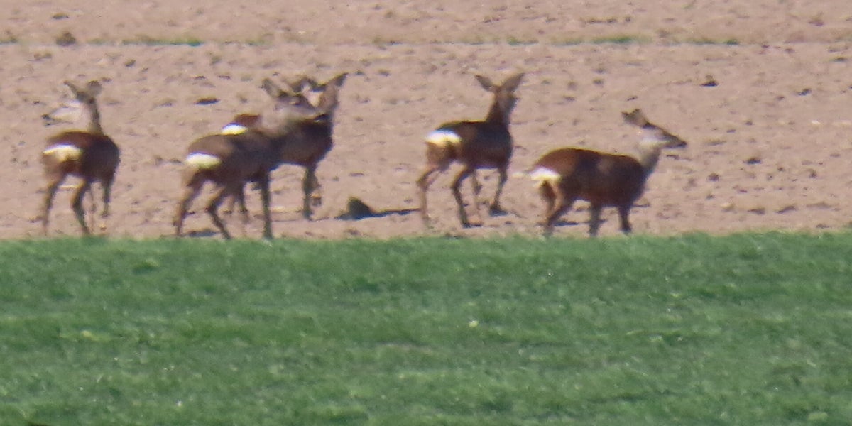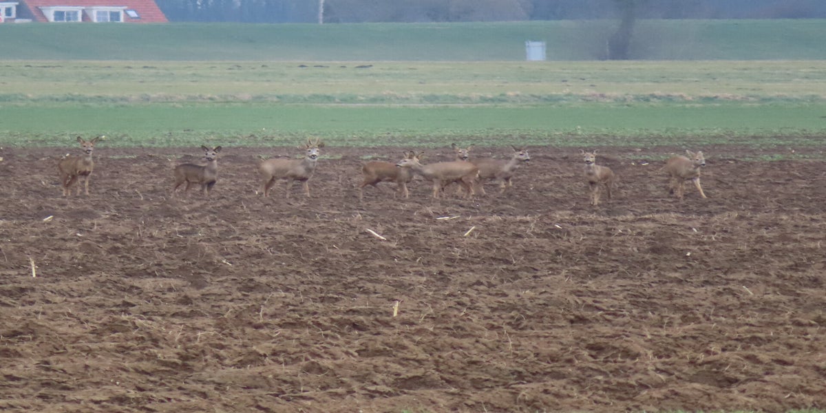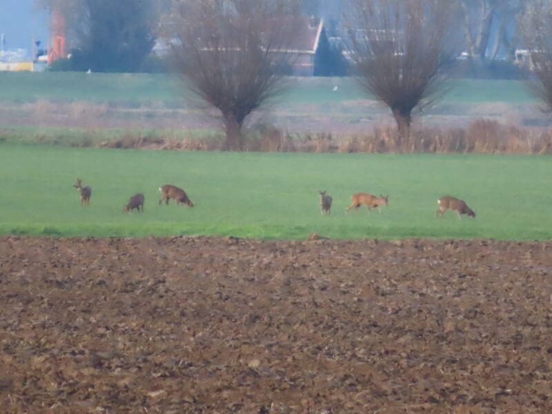 Voor de reeën zit een haas en een groep kieviten en spreeuwen