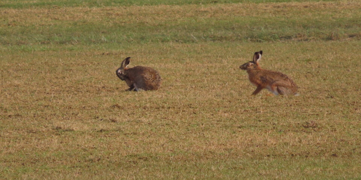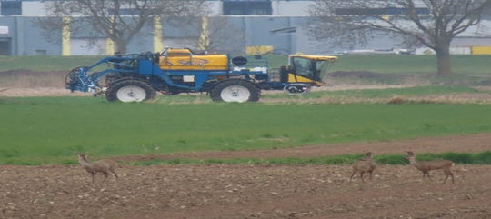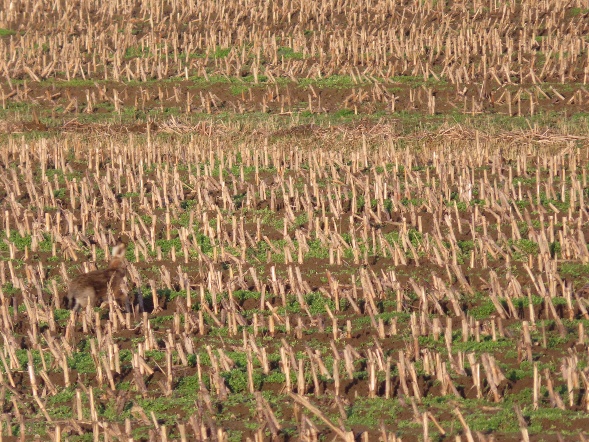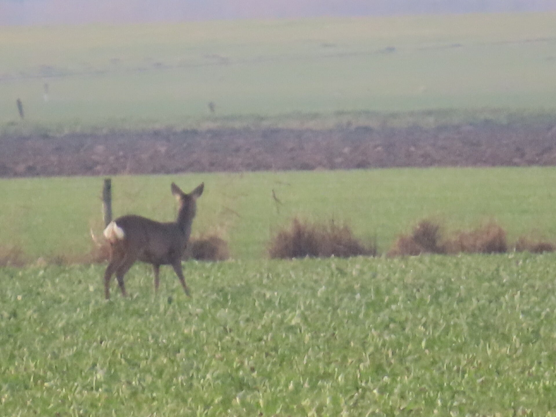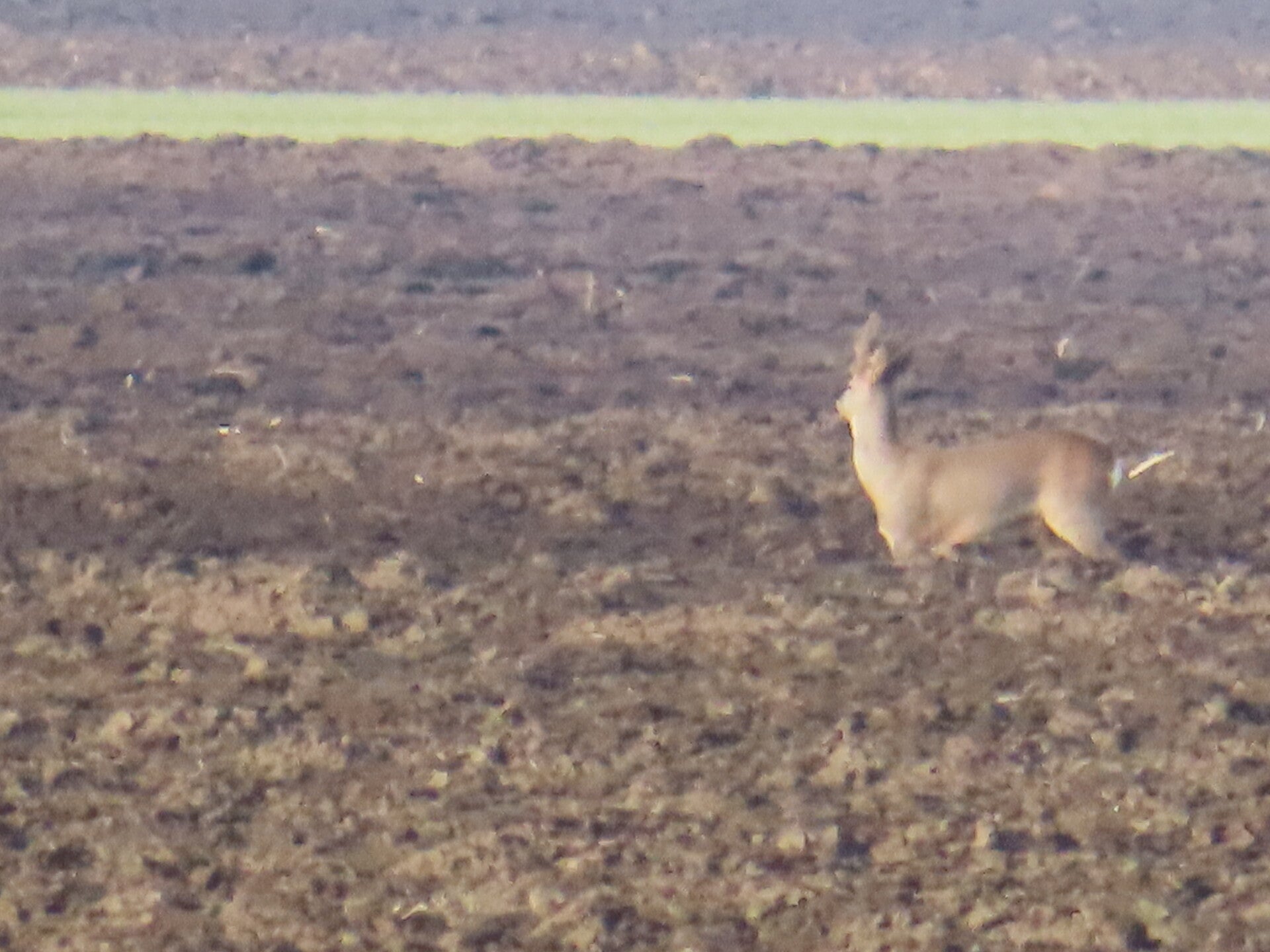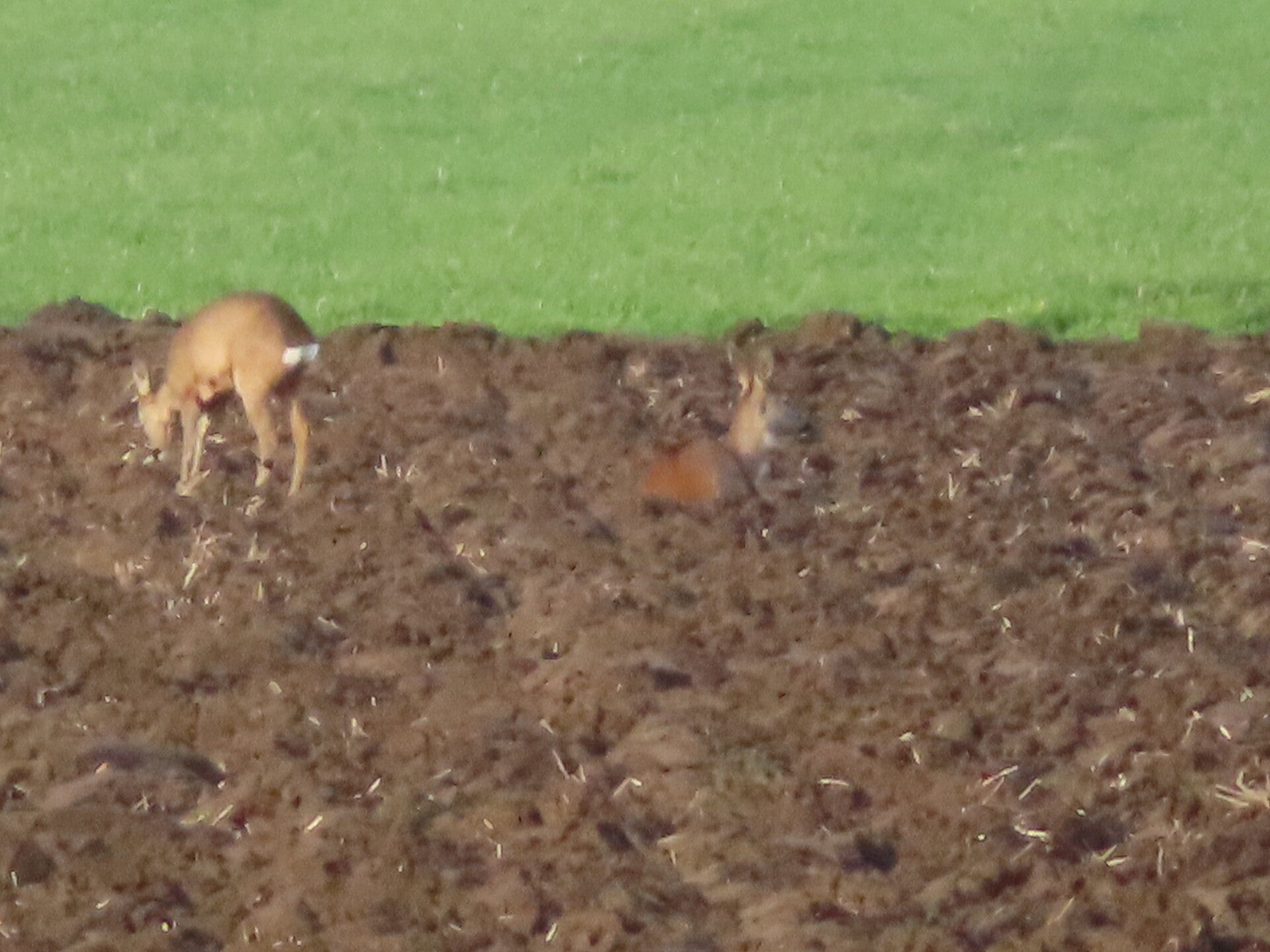 Voor de reeën zit een haas en een groep kieviten en spreeuwen